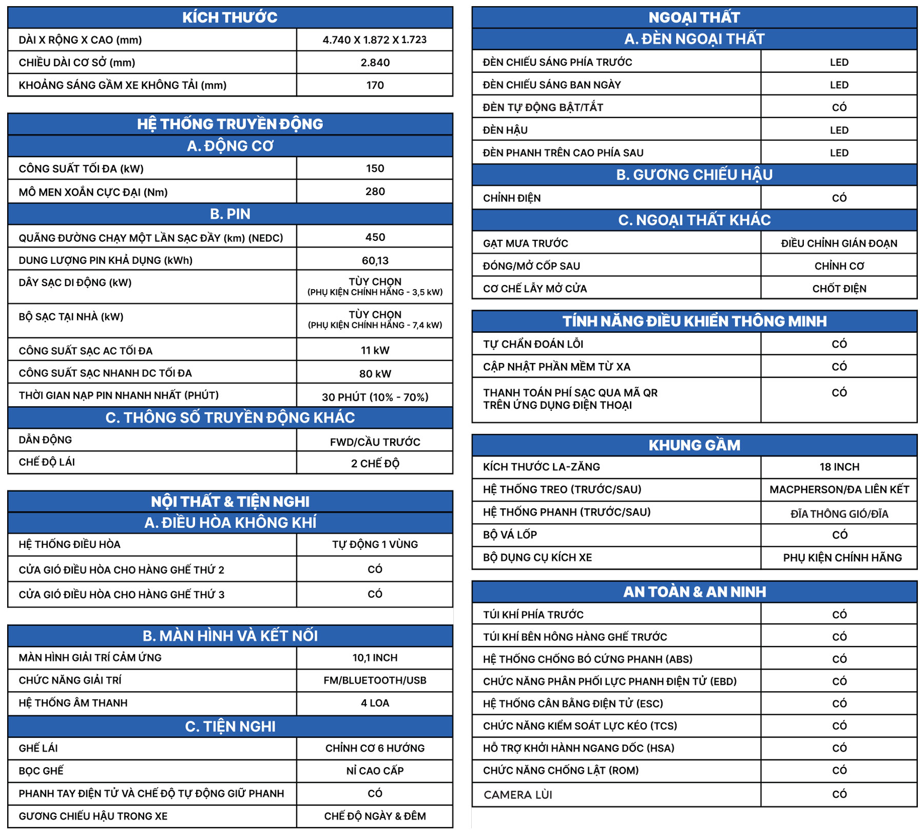 VinFast Limo Green 7 chỗ. Xe có kích thước các chiều 4740 x 1872 x 1728 mm, chiều dài cơ sở 2840 mm, đủ không gian rộng rãi cho 3 hàng ghế. Sử dụng pin LFP, Limo Green có khả năng di chuyển lên tới 450 km sau mỗi lần sạc đầy.