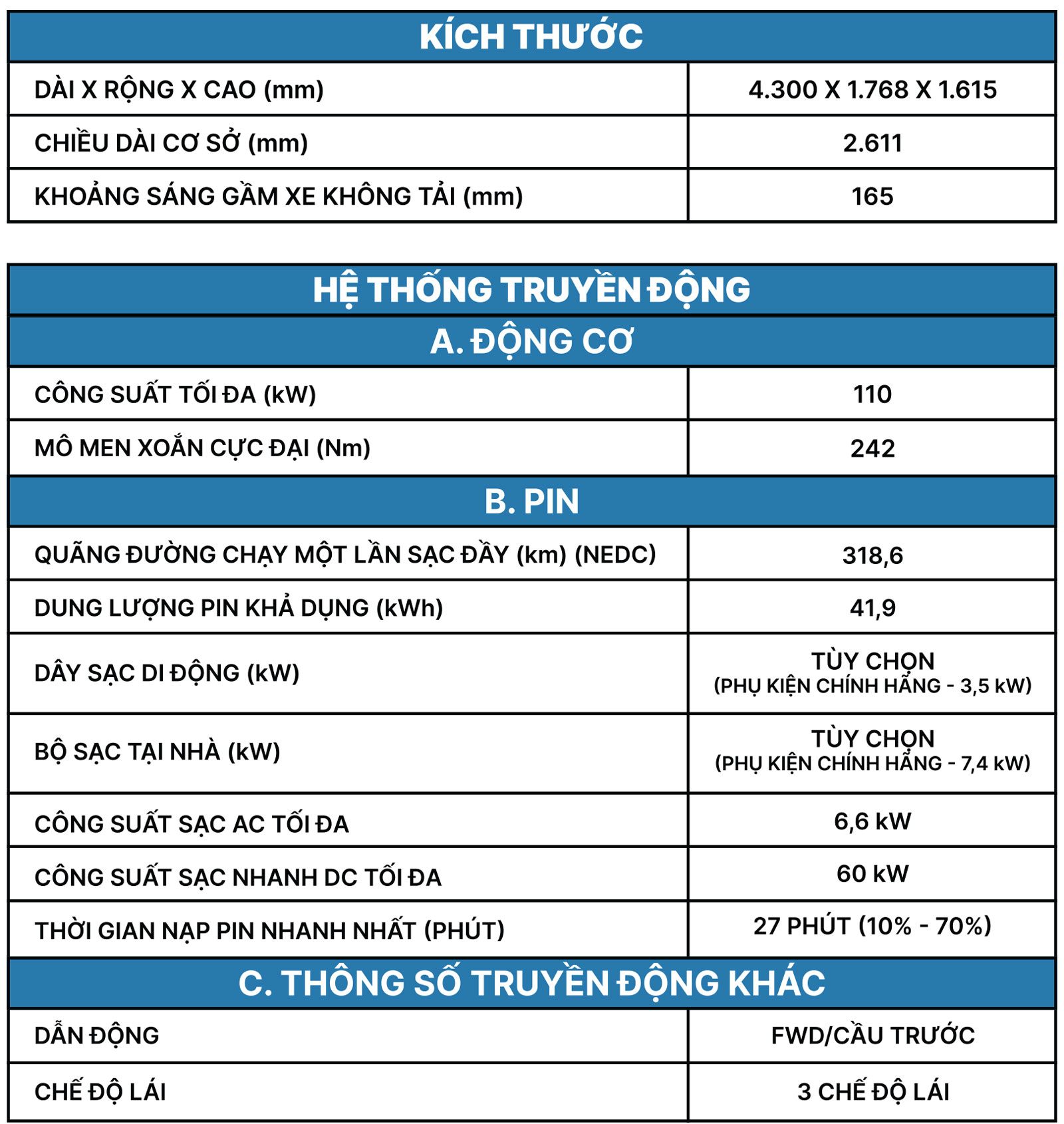 VinFast Nerio Green có chiều dài cơ sở lên tới 2.611 mm, chiều dài tổng thể 4.300 mm, mang đến không gian nội thất rộng rãi, thoải mái cùng khoang chứa đồ lớn, phù hợp với phân khúc dịch vụ cao cấp hơn. Xe hướng đến nhóm khách hàng đề cao trải nghiệm ở hàng ghế sau cùng những tính năng thông minh, công nghệ an toàn hiện đại. Nerio Green có khả năng di chuyển tối đa hơn 318 km sau mỗi lần sạc đầy, thời gian sạc pin từ 10% lên 70% chỉ trong 27 phút.