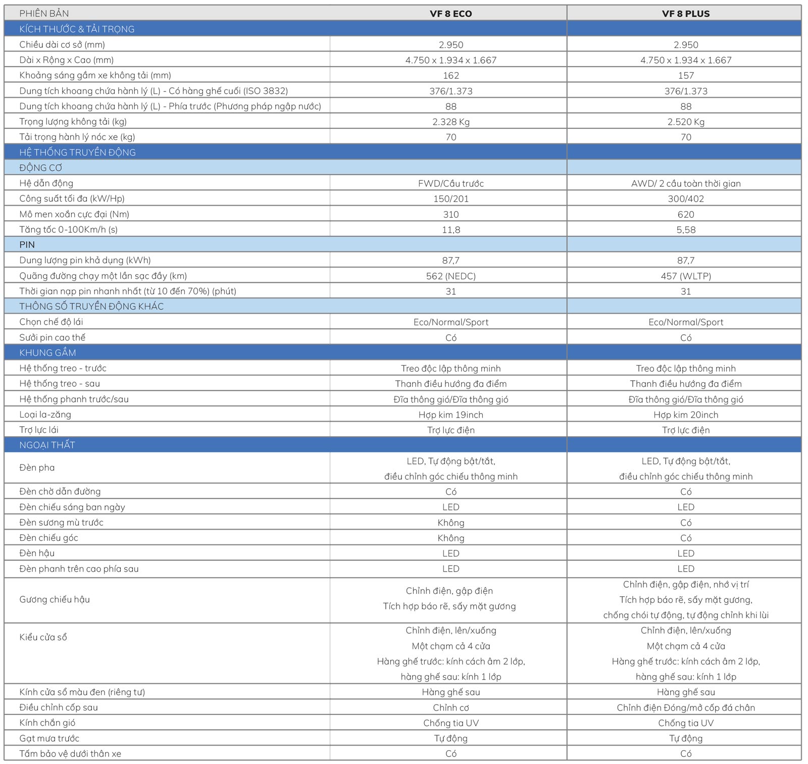 VinFast VF 8 với thiết kế mới sang trọng và công nghệ vượt trội. Với nhiều điểm nổi bật: ngoại thất nhiều màu, công nghệ trợ lý ảo Vivi 2.0 mới, ADAS và VF Connect. VinFast VF 8 có hai tùy chọn là phiên bản VF 8 Eco và phiên bản VF 8 Plus, trong đó phiên bản VF 8 Eco được trang bị động cơ điện có công suất 350 mã lực, đi được quãng đường 562km/lần sạc đầy, trong khi phiên bản VF 8 Plus có sức mạnh lên tới 402 mã lực, đi được quãng đường 457km/lần sạc đầy.