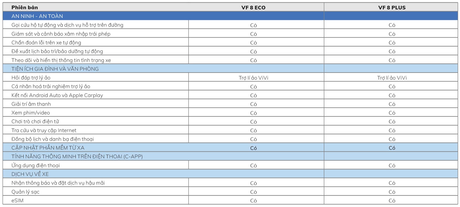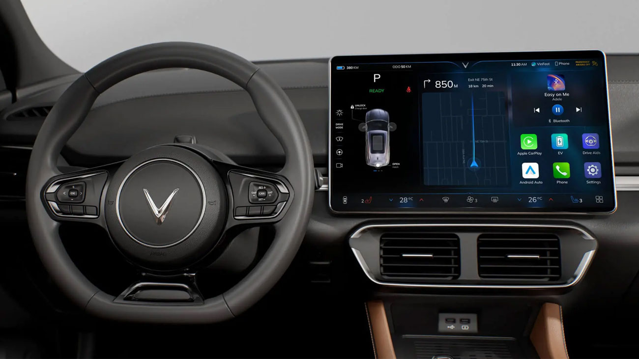 Ứng dụng VinFast: Với ứng dụng VinFast, Khách hàng kiểm tra tình trạng của các trạm sạc, xem dữ liệu về xe, đặt lịch bảo dưỡng, trợ giúp. Quan trọng hơn, ứng dụng VinFast giúp điều khiển xe, bật điều hòa từ xa để bạn luôn thoải mái ngay từ khi bước lên xe.